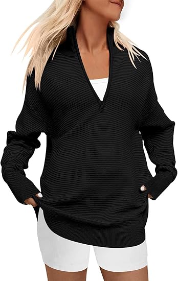 Fall Women V Neck 1/4 Zip Pullover Stretch Sweater Long Sleeve Stand Collared Ribbed Knitted Solid Sweaters
