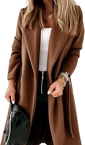 Womens Classic Coat Lapel Collar Open Front Belted Long Jacket