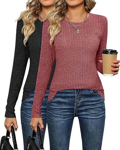 2 Pack Women's Sweaters, Fall Long Sleeve Fitted Sweaters Cable Knit Light Tunic Tops Crew Neck Sweaters Trendy