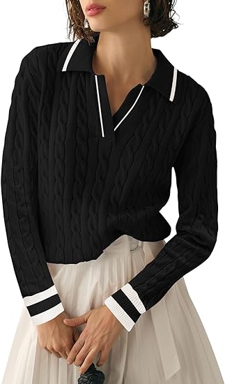 Womens Fall Long Sleeve Sweaters Lapel V Neck Cable Knitted Pullover Casual Soft Jumper Top