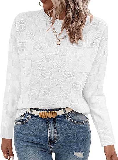 Women Lightweight Sweaters Crewneck Long Sleeve Block Knit Pullover Shirts Tunic Tops with Pocket