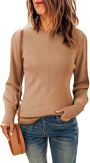 Womens Ribbed Knit Long Lantern Sleeves Sweater Crewneck Casual Slim Fit Pullover Jumper Tops